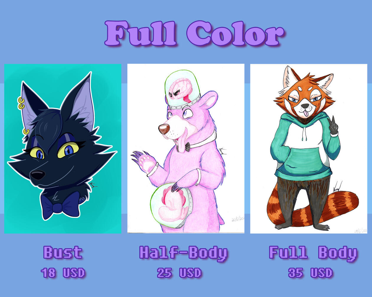Full NSFW w/ genitals - 50 USD---------------------------Those prices are just general guidelines and can be negotiable.All prices listed above are additive to the main price table. For exemple, if you want a lewd drawing of a half body, fully colored with markers, the total price would be 20 USD (full color half body) + 5 USD (Markers) + 30 USD (Lewd drawing) = 55 USD in total.