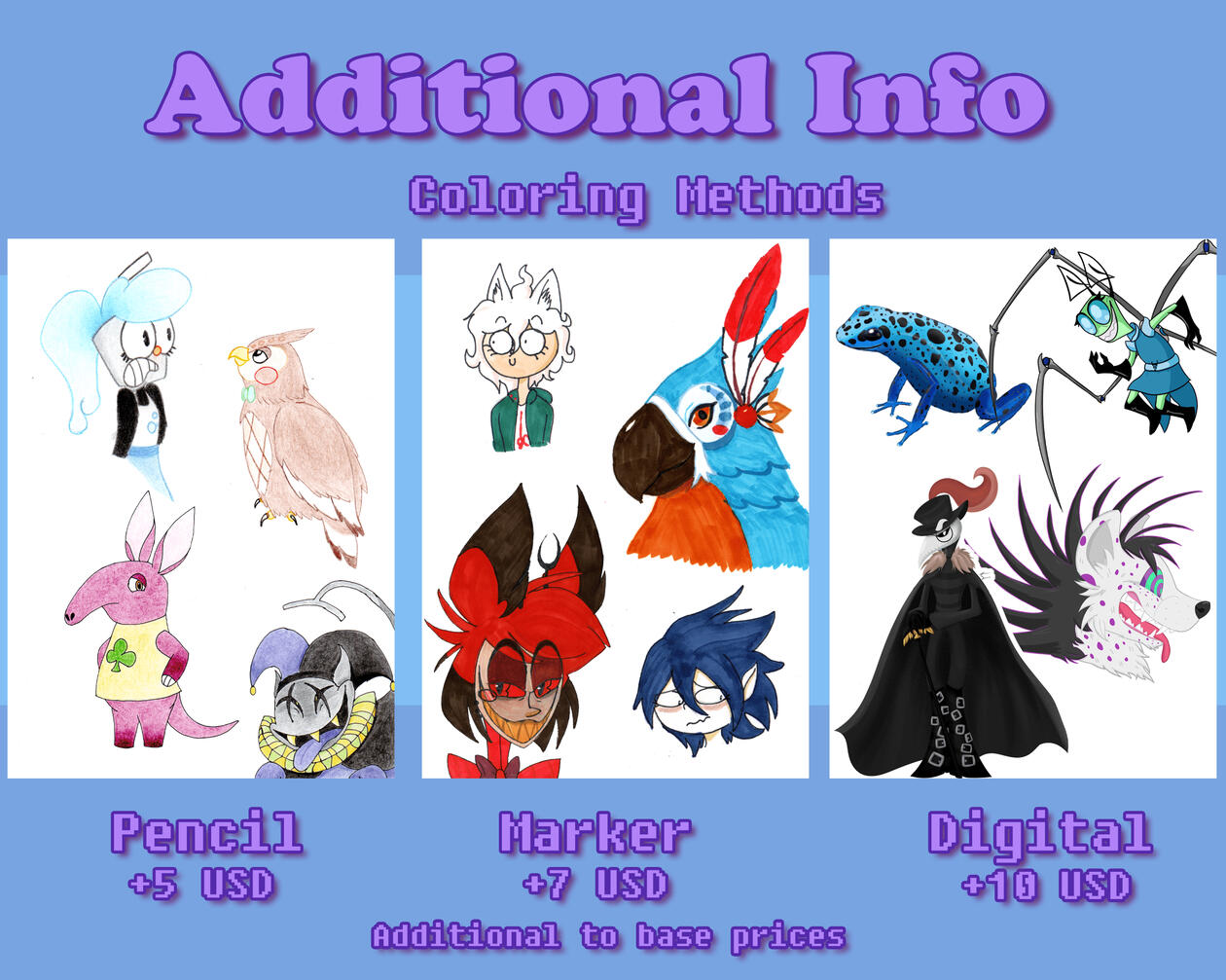 5. ClosedCURRENTLY ONLY ACCEPTING ICON COMMISIONS!The prices above apply per character, so two characters on one canvas is double price! However, the prices are general guidelines and are negotiable based on the complexity of the piece and the amount of time (hours) needed to complete it.---------------------------I WILL DRAW